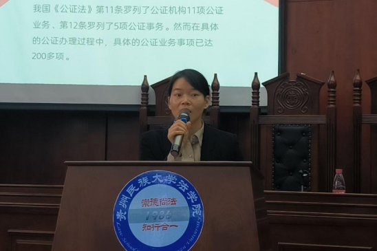 第二,由贵州省公证协会副会长谢秋向同学们介绍我国公证机构业务及公证制度的优势。