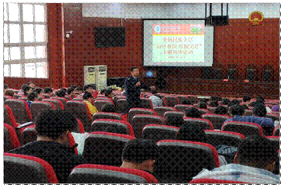 法学院邀请贵阳市公安局花溪分局松山派出所警官赵普林,在模拟法庭作“心中有法 校园无诈”反诈知识宣传教育讲座,学院近300名师生参加。讲座由学院党委委员、副院长张帆教授主持。