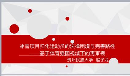 2018级国际法学专业研究生赵子龙参与了第三分论坛的专题报告,通过线上的方式做了题为《冰雪项目归化运动员的法律困境与完善路径——基于体育强国视域下的再审视》的汇报,受到与会专家学者的好评。
