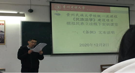 12月2日,傅智文老师的民族法学课堂采取模拟自治立法讨论形式。课堂以某自治州条例草案审议为例,分为草案报告、分组讨论、分组汇报、总结四个阶段,并在课程教学中融入课程思政因素。