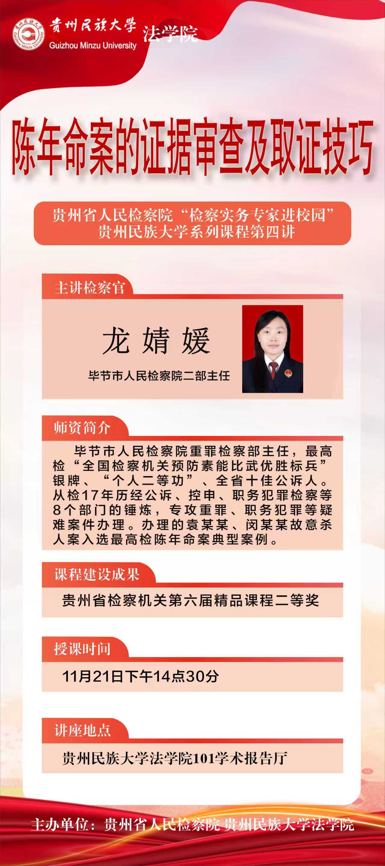 毕节市人民检察院重罪检察部主任,最高女“全国检察机关预防素能比武优胜标兵,银牌、“个人二等功”、全省十佳公诉人从检17年历经公诉、控申、职务犯罪检察等8个部门的锤炼,专攻重罪、职务犯罪等疑难案件办理。办理的袁某某、闵某某故意杀人案入选最高检陈年命案典型案例。