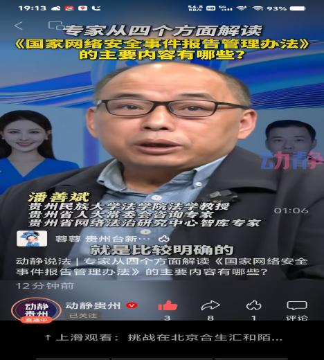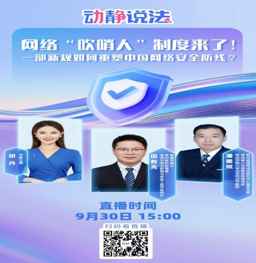 省人大常委会咨询专家、省网络法治研究中心智库专家、法学博士、博士生导师潘善斌教授与贵州大学大数据与信息工程学院院长、省科协常委、军事学(密码学方向)博士、博士生导师田有亮教授一起做客贵州省广播电视台“动静贵州”频道“动静说法”栏目,通过直播的方式共同解读《国家网络安全事件报告管理办法》。