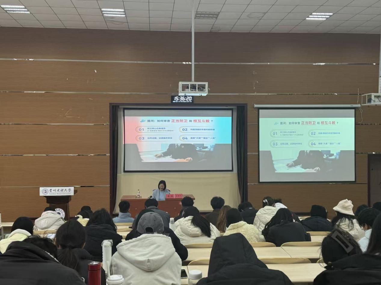 法学院联合主办,毕节市人民检察院第一检察部副主任潘珣同志主讲。潘珣检察官是全省十佳公诉人,全省检律辩论赛“优秀辩手”,全省检察机关先进个人,毕节市优秀共产党员,其办理的杨某等人非法采矿系列案获最高检典型案例,李某某等人生产销售不符合安全标准的食品案被最高检全国食品安全宣传采用,丁某污染环境等案例获全省典型案例。